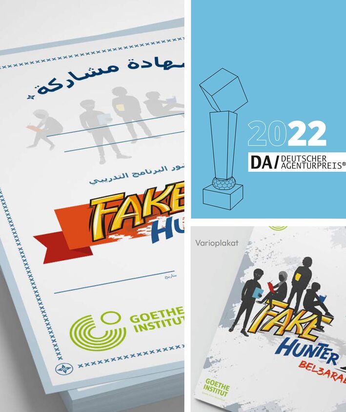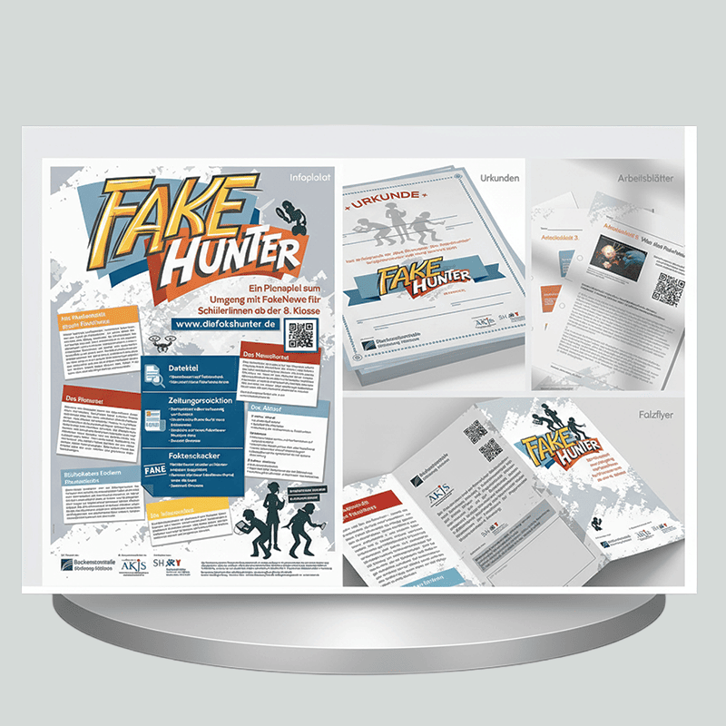 Mit FakeHunter entstand 2018 ein innovatives Planspiel, das Schüler*innen ab Klasse 8 befähigt, Fake News zu enttarnen und Medien kritisch zu hinterfragen. Wir entwickelten dafür das komplette Erscheinungsbild: vom Logo über Arbeitsmaterialien, Plakate und Flyer bis hin zur Website mit Newsportal und interaktiven Prüfwerkzeugen.