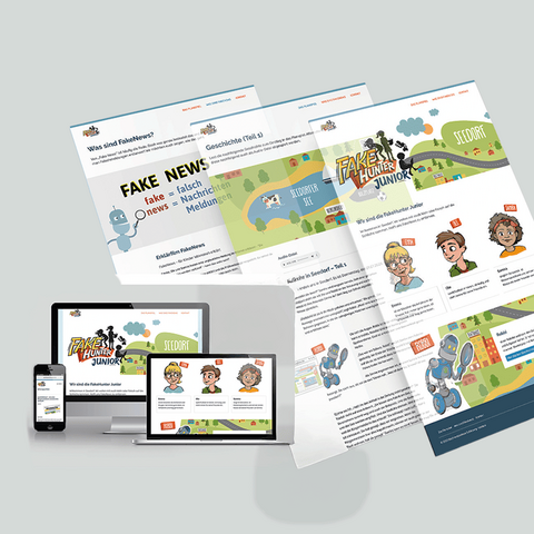 2021 erweiterten wir das Konzept mit FakeHunter Junior, einer kindgerechten Version für Grundschüler*innen. Mit multimedialen Aufgaben, Illustrationen und einer Detektivgeschichte lernen Kinder schon früh, Wahrheit und Lüge auseinanderzuhalten.